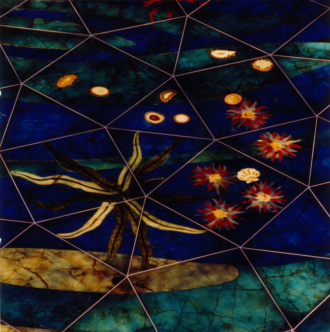 Supplied back lighted stone floor inspired to marine sea bed composed of onyxes and semi-precious stones inlays.